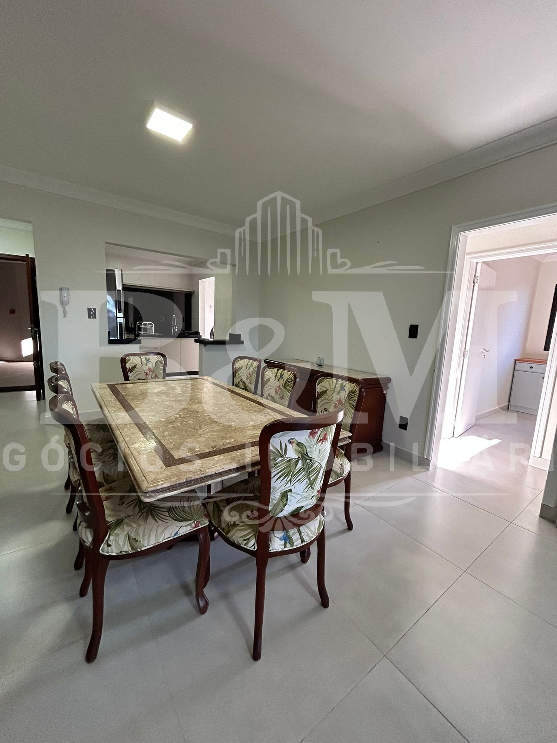 Ampla sala de estar e jantar com mesa para 8 pessoas e TV;