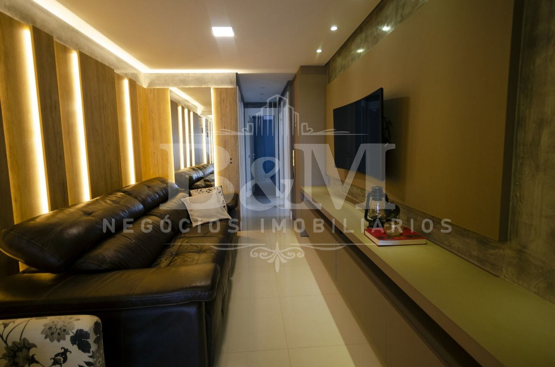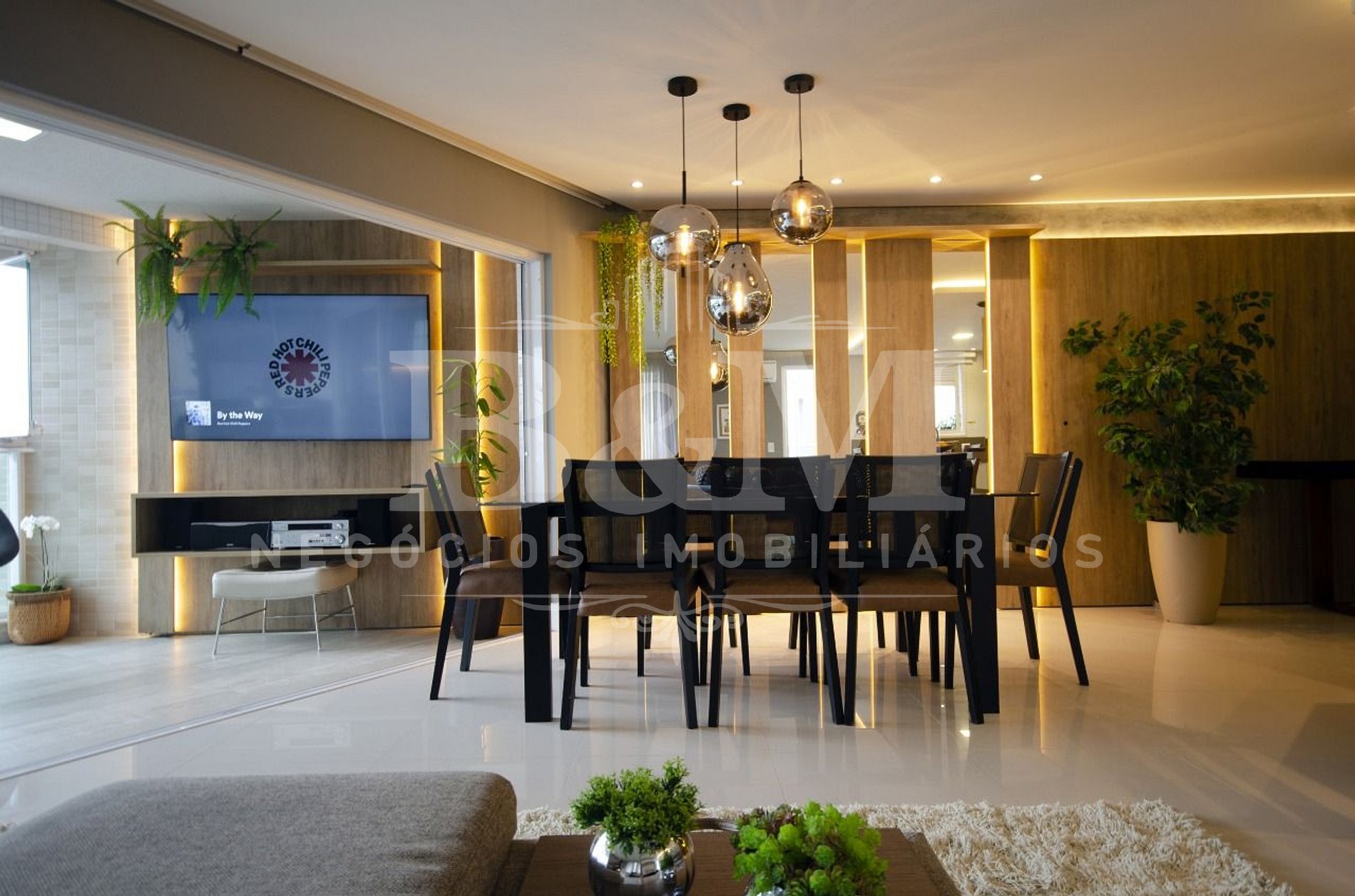 Sala de estar com ar condicionado, integrada com sala de jantar e cozinha;