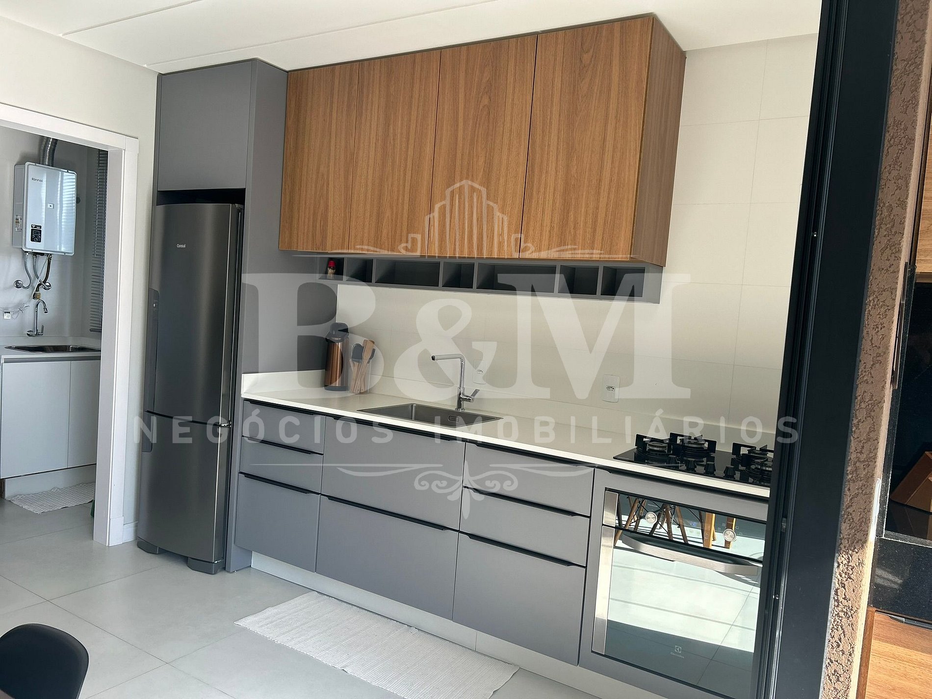 A sala de estar é integrada à varanda, proporcionando um ambiente acolhedor para reunir todos. A cozinha completa permite preparar suas próprias refeições.