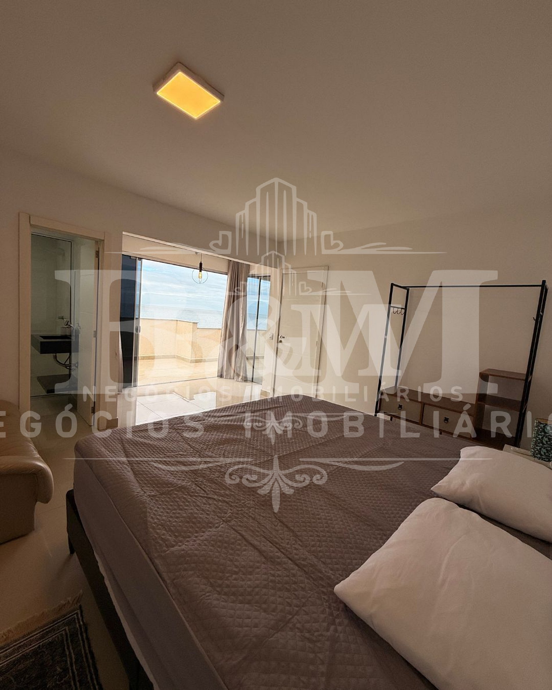 No segundo pavimento, encontra-se a suíte máster com excelente espaço e o destaque do imóvel: um amplo terraço privativo com churrasqueira, perfeito para momentos de lazer em família e amigos, apreciando a vista panorâmica do mar.